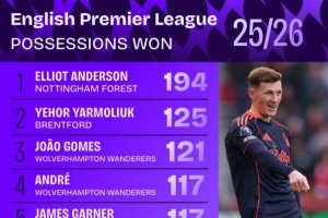 体育资讯1月27日讯 Squawka统计了本赛季球员在英超夺得球权的次数,并列出榜单,埃利奥特·安德森194次断层居首。