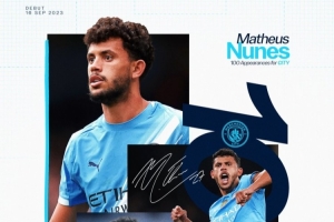 此役这名球员迎来曼城生涯百场里程碑,此前出战的99场比赛,努内斯贡献5球21助攻,随队获得了英超、社区盾、世俱杯共3个冠军。