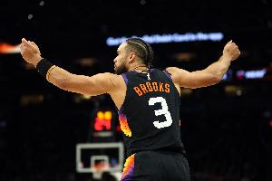 太阳猛将狄龙在第三节彻底爆发,他单节8投6中(三分3中2)、罚球2中1,砍下15分2篮板2助攻2抢断,率队拉开分差。