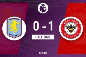 伤停补时4分钟。上半场比赛结束,阿斯顿维拉0-1布伦特福德。