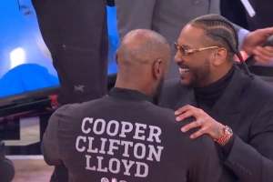 GIF-詹姆斯赛前和安东尼、麦迪拥抱寒暄