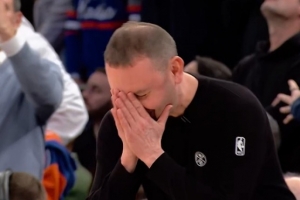 GIF-布劳恩抢到篮板,阿努诺比脚下拌蒜被绊倒,裁判吹进攻犯规,掘金挑战成功但没暂停了