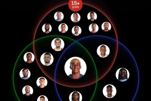 数据统计显示,能够满足“进球15+、助攻10+、过人75+”其中任何一项的球员都不在少数,但同时满足两项的已经屈指可数:
