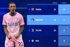体育资讯2月10日讯 《转会市场》统计了本赛季五大联赛U21球员进球情况,18岁的亚马尔居首。
