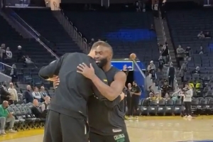 将要首秀的新援波尔津吉斯赛前进行了热身,而他的绿军前队友杰伦·布朗与怀特则是上来与其进行了互动。