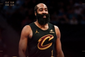 赛后骑士官方晒出哈登海报,配文:骑士队又赢了!