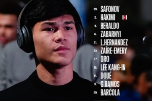 39-萨福诺夫、2-阿什拉夫、4-贝拉尔多、6-扎巴尔尼、21-卢卡斯、33-扎伊尔·埃梅里、27-德罗、19-李刚仁、14-杜埃、9-贡萨洛·拉莫斯、29-巴尔科拉