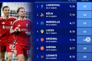 体育资讯2月23日讯 在本轮英超,利物浦1-0击败诺丁汉森林,麦卡利斯特补时读秒绝杀。德转也盘点了本赛季五大联赛在补时阶段进球+失球最多的球队榜单,具体如下:
