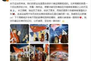 今日苏翊鸣更新社媒,晒出自己担任旗手的照片,并配文写道: