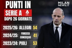 体育资讯2月24日讯 本赛季AC米兰在前26轮意甲过后积分54分,此数据比上赛季同期提升明显,以下为近几个赛季AC米兰在26轮后同期积分情况: