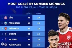 体育资讯2月24日讯 曼联在本轮英超客场1-0小胜埃弗顿,舍什科替补打进制胜球。德转数据统计显示,舍什科当前位列本赛季五大联赛新援进球榜第24位。