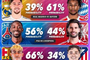 体育资讯03月19日讯 欧冠八强已经全部产生,外媒Score90根据相关机构赔率,列出了各队晋级四强的概率。在1/4决赛中四组对阵中,拜仁、巴黎、巴萨、阿森纳拥有更高的晋级概率。