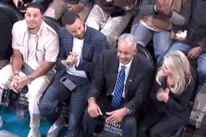 心情不错!德罗赞和威少开拓者主场观战耐克峰会 两人有说有笑