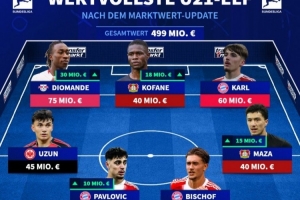 体育资讯3月21日讯 德古转会市场列出德甲U21球员身价最高阵容,帕夫洛维奇、卡尔、扬·迪奥曼德、武什科维奇在列。