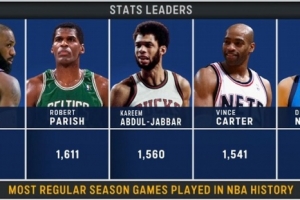 历史出场数排名:詹姆斯1612场、帕里什1611场、贾巴尔1560场、卡特1541场、诺维茨基1522场