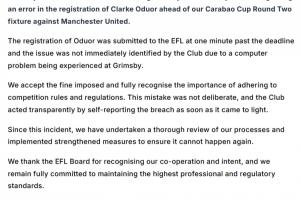 奥多的注册在截止时间后一分钟提交给EFL,由于格林斯比的电脑问题,俱乐部未能立即发现该问题。我们接受所施加的罚款,并完全认识到遵守比赛规则和规定的重要性。这一错误并非故意,俱乐部在发现违规后立即主动报告。