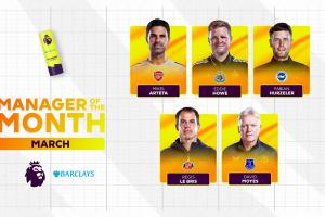 体育资讯03月26日讯 英超官方公布了英超联赛3月最佳主教练候选名单,共有5名教练入围,分别是阿尔特塔、埃迪·豪、赫尔泽勒、勒布里斯以及莫耶斯。