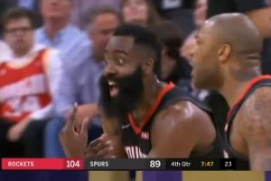 2019年12月4日,火箭对马刺的比赛第四节,哈登抢断快攻无人防守,完成一次大力扣篮。球以很大力量砸进篮筐,先完全穿过篮网(从上到下通过篮圈和网),但由于力量太大,球被篮网“缠住”并反弹向上,从篮圈上方再次弹出,看起来像“没进”或直接从篮筐上弹走。