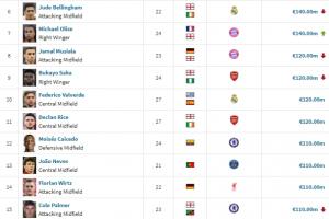 8-穆西亚拉、萨卡、巴尔韦德、赖斯,1.2亿