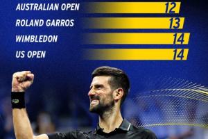 据统计,德约生涯一共53次晋级大满贯四强,其中澳网12次、法网13次、温网和美网均14次。