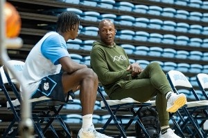 美国篮球名人堂成员、前NBA全明星雷-阿伦到访北卡大学男篮的训练馆,出席球队训练,并对球员们的表现进行观摩和指导。照片中出现的有今年大一新生、2025届全美第五的Caleb Wilson(图一)、还有前NBA球员肖恩-梅(图二下)等人。