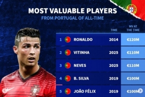体育资讯3月31日讯 德转列葡萄牙球员历史身价榜,C罗2014年1.2亿欧身价最高,维蒂尼亚、若昂·内维斯1.1亿欧并列第二。