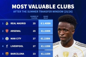 体育资讯9月3日讯 德国转会市场统计了夏窗结束之后各俱乐部的球员身价,并列出榜单,皇马14亿欧居首,阿森纳、曼城二三位,曼联7.48亿欧排名第10位。