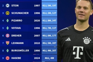 体育资讯4月4日讯 拜仁客战弗赖堡的比赛正在进行当中,诺伊尔首发出战,凭借本场比赛,他正式进入德甲联赛“40岁俱乐部”。
