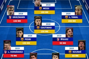 前锋:格列兹曼(1.5亿欧,2018年)、梅西(1.8亿欧,2018年)、亚马尔(2亿欧,2025年)