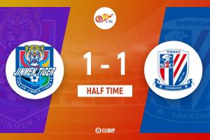 上半场补时第5分钟,高天意开出左路角球,朱辰杰头球攻门,皮球发生折射后飞入球网,申花1-1扳平津门虎。↓