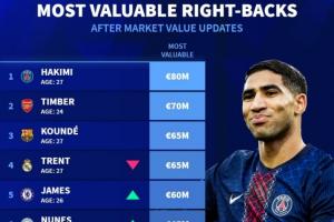 体育资讯4月7日讯 德国转会市场公布了最新的足坛右后卫身价排行榜,其中巴黎圣日耳曼右后卫阿什拉夫以8000万欧元,位列第一。
