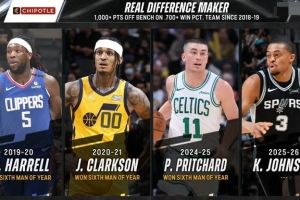 转播方晒出一组数据图片:自2018-19赛季以来,替补球员单赛季砍下至少1000分且球队胜率70%以上的球员有: