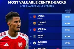 体育资讯4月7日讯 德国转会市场公布了最新的足坛中卫身价排行榜,其中阿森纳中卫萨利巴以9000万欧元,高居榜首。