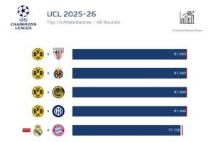 体育资讯04月09日讯 欧冠1/4决赛首回合比赛结束,数据媒体Football meets data统计了截至目前本赛季欧冠上座人数前十的比赛。多特4场比赛均满座,以81365人并列第一,昨天皇马vs拜仁的比赛以77106人位列第五。