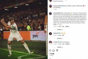他也在赛后通过社媒晒出自己的高尔夫挥杆庆祝照,并配文:“似曾相识!鹿特丹之夜晚真是棒极了❤️🤍波兰队!”