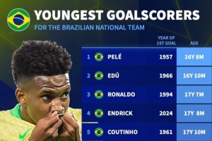体育资讯9月5日讯 巴西在本轮世预赛3-0完胜智利,小将埃斯特旺打进国家队生涯处子球。《转会市场》也统计了巴西队史的最年轻进球者榜单,埃斯特旺位居第8。