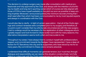 手术决定是在与医疗团队协商后作出的,并得到俱乐部的完全认可。此举始终以我的健康和长远职业生涯为首要考虑,而这自然与巴萨的目标完全一致:让我尽早以最佳状态回归,继续为冠军而战。此外,我已公开宣布术后所需的最短恢复期,这一时间基于权威专家的评估,且始终与俱乐部保持同步。