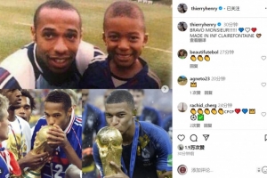 亨利社媒晒出自己与姆巴佩昔日的合照,并配文:“干得好,小伙子!克莱枫丹制造!”