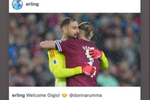哈兰德此前在社交媒体晒出自己与多纳鲁马拥抱的照片,并配文:“欢迎你,多纳鲁马!”