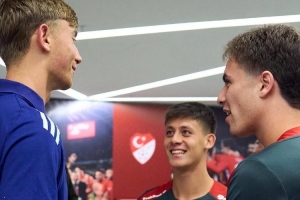 西班牙队官方社媒晒出视频,西班牙后卫赫伊森赛前与土耳其国脚居勒尔、伊尔迪兹见面寒暄。