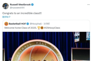 威少在社媒上向这届名人堂成员送上了祝贺,写道:“恭喜他们,了不起的一届!!!”