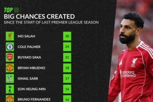 体育资讯9月7日讯 WhoScored列出了英超上赛季至今创造重大机会榜,萨拉赫30次居首,帕尔默、萨卡二三位。