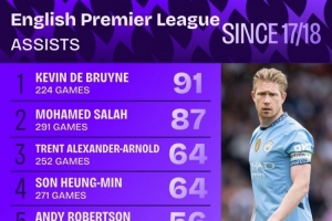 体育资讯9月7日讯 Squawka统计了2017-2018赛季以来球员在英超助攻的次数,并列出榜单,德布劳内91助居首,萨拉赫87助次席。