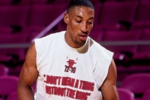 图片中,皮蓬穿着一件纪念公牛95-96赛季常规赛取得72胜10负的运动衫,衣服上印着:没有戒指的话,一切都没有意义。