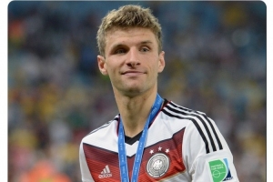 德国队社媒晒出穆勒与大力神杯的合照,配文:“生日快乐,托马斯!2014年世界杯冠军、2010年世界杯最佳射手。”
