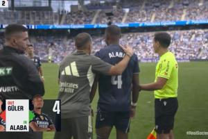 伤停补时阶段,皇马用阿拉巴换下居勒尔,阿诺德、阿森西奥、加西亚、阿拉巴、米利唐、卡雷拉斯6名后卫同时在场上进行防守。