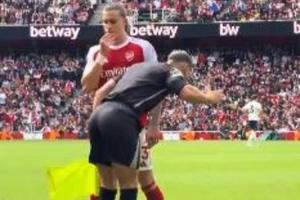 体育资讯09月14日讯 本轮英超阿森纳3-0完胜诺丁汉森林,比赛中有球迷在场边拍到了滑稽的一幕。