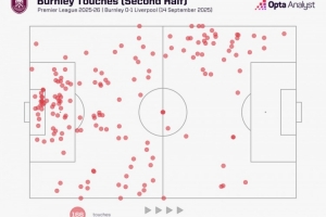 据统计,伯恩利在本场比赛下半场没有一次在利物浦禁区内触球,而利物浦则有41次对手禁区触球,最后一次就是萨拉赫的点射绝杀。