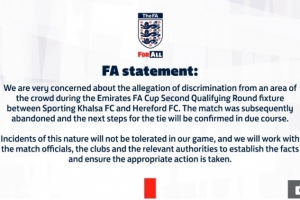 Sporting Khalsa随后也发布了一份声明,称在对阵Hereford的足总杯比赛中,下半场发生了针对其守门员Ravan Constable的种族歧视言论。