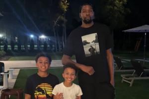 体育资讯09月15日讯 现火箭队球探、前火箭球员DJ-奥古斯汀今日更新Instagram,晒出了自己俩儿子和杜兰特的合影,并写道:“杜叔叔@杜兰特。”